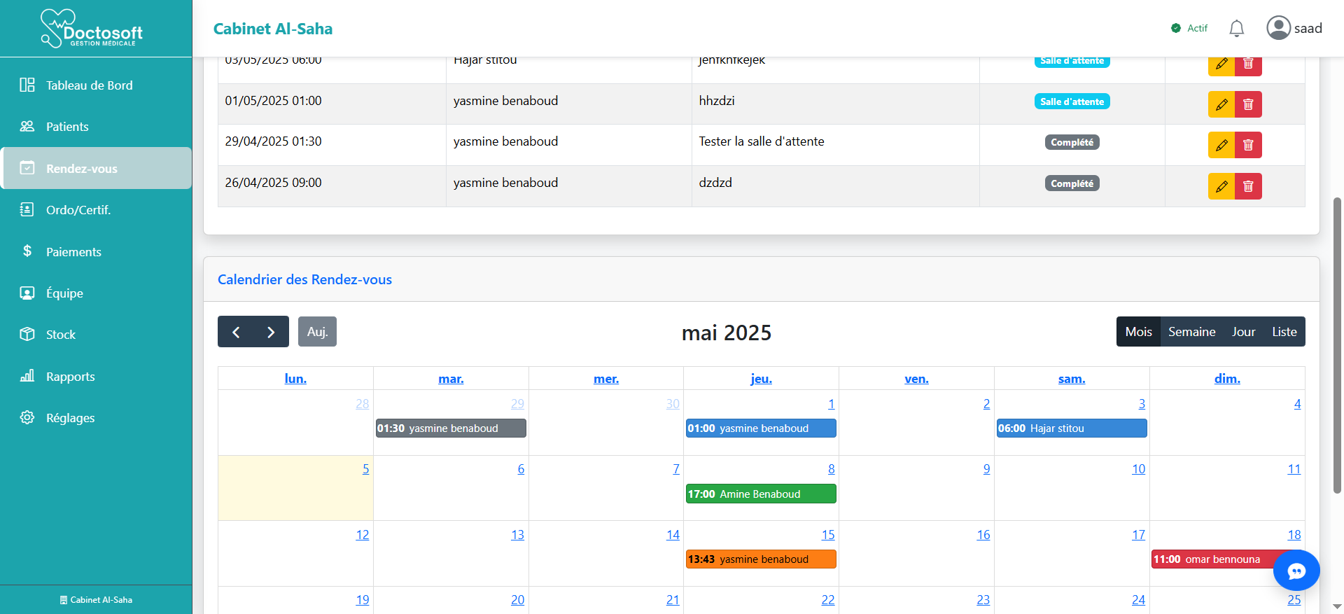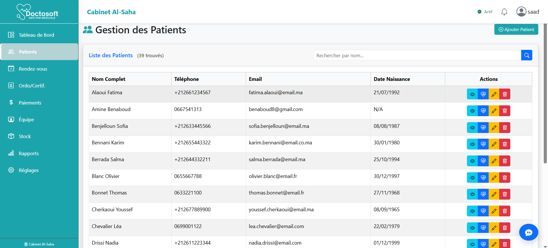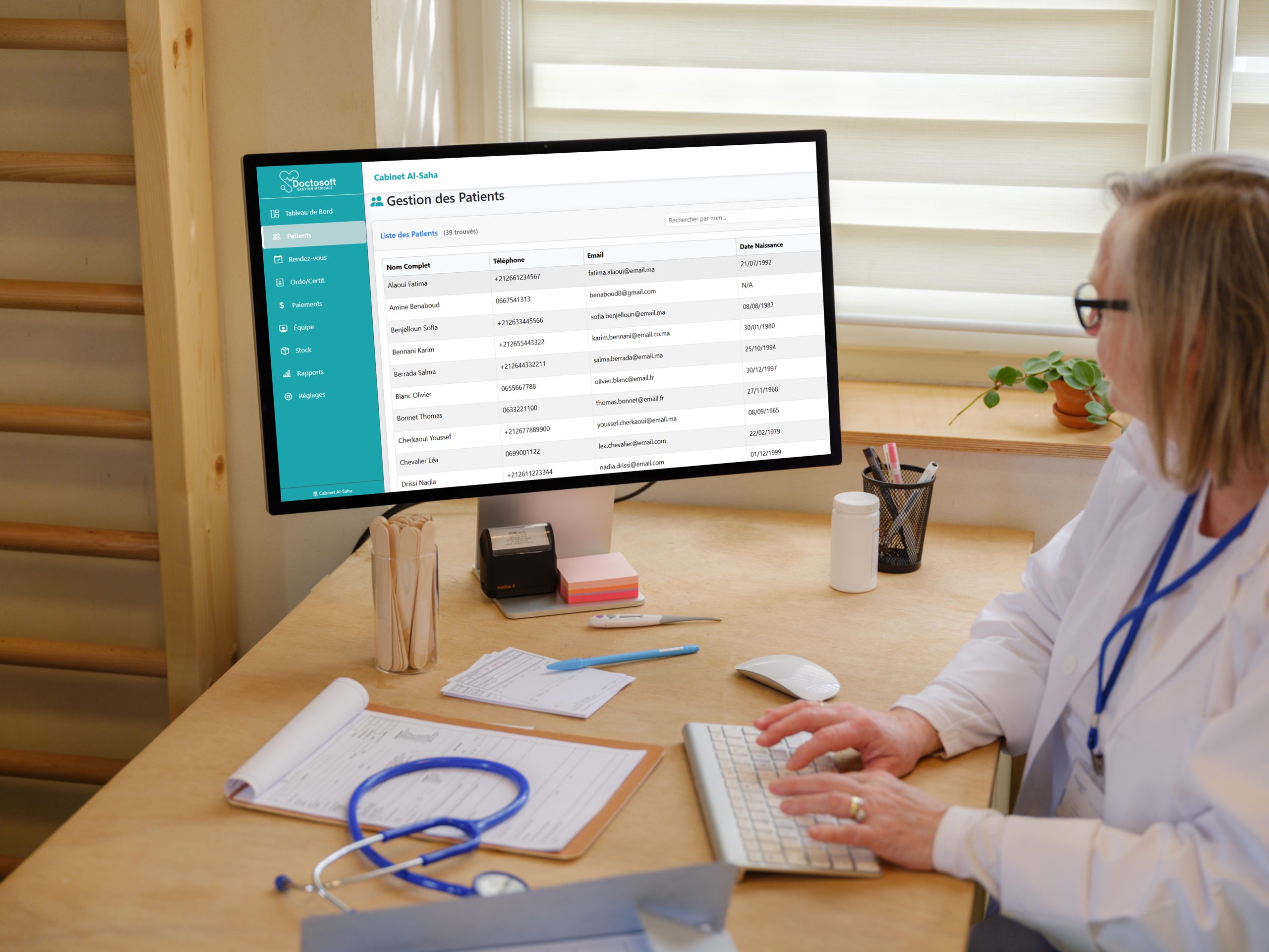 Grâce à DoctoSoft, notre équipe (médecins, réceptionnistes) collabore sans frictions. Les rôles personnalisés et le chatbot IA pour les rapports simplifient tout. Le suivi des stocks de médicaments est un gain de temps énorme. Et l’app mobile est aussi rapide que la version desktop !